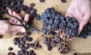 casa habitada, en la que de un momento a otro, aparecerán sus dueños. En una de las habitaciones encontraréis una pequeña exposición con recortes de prensa, documentos, fotografías y carteles con los que se puede seguir la historia de la pasa y su relación con este pueblo. Y en lo que era la vieja cuadra hay objetos como tijeras de podar, cuerdas de esparto, cribas para seleccionar las pasas según su tamaño, moldes para empaquetarlas, etc. Si no lo habéis hecho antes, aquí descubriréis que la pasa de Málaga tiene pepita (y se come así, con pepita). También veréis que se comercializa tanto en grano como en racimo. Las que van así, en racimo, son solo las de categoría superior. Las otras, que son igualmente fabulosas, se deben cortar una a una del racimo una vez listas. Y se hace con unas tijeras de punta afilada… ¡y con mucha paciencia!