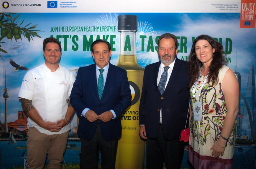 La Unión Europea y el Interprofesional del Aceite de Oliva Español a través de su marca de promoción Aceites de Oliva de España, han lanzado una campaña de tres años para amantes de la cocina y viajeros del mundo para unirse a la Dieta Mediterránea y al estilo de vida saludable europeo a través del «Olive Oil World Tour«. El programa multicanal incluye el «Olive Oil Lounge«, donde los viajeros pueden disfrutar de los mejores aceites de oliva en el mundo en una biblioteca oleo itinerante. Hay degustaciones exprés, un área para relajarse, zona para niños y zonas Wi-Fi para que el público pueda viajar virtualmente al mundo del «oro líquido». La campaña también brinda al consumidor información sobre las categorías reconocidas por la Unión Europea de los diferentes aceites de oliva (Aceite de Oliva Virgen Extra, Aceite de Oliva Virgen, Aceite de Oliva); sus usos en la cocina y sus variedades (Picual, Hojiblanca, Arbequina y Cornicabra). Estos espacios exclusivos estarán en aeropuertos, estaciones de tren y terminales de cruceros en Nueva York, Miami, Chicago, Los Ángeles y San Francisco. Olive Oils From Spain también viajará a otros ocho países (España, Alemania, Reino Unido, Bélgica, Países Bajos, China, Japón y Taiwán). La campaña incluyó el evento de lanzamiento de anoche en los EE. UU, en el que los invitados experimentaron de primera mano la versatilidad de este manjar europeo junto con las presentaciones de los representantes del aceite de oliva europeo. Asimismo, está planeada una cena íntima con un famoso chef y una clase de slow-cooking para el otoño, donde los huéspedes aprenderán sobre la calidad, las variedades, los métodos de producción europeos y las clasificaciones comerciales del aceite de oliva europeo.