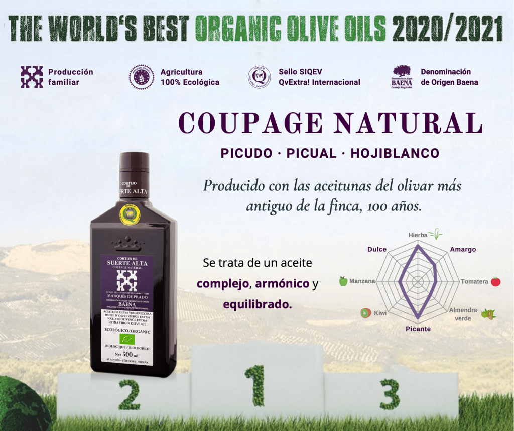 Coupage Natural es el AOVE más representativo de Cortijo de Suerte Alta y proviene de olivos centenarios de tres pies; es un aceite complejo, armónico y equilibrado que conquista con sus propiedades: el Picudo le da una entrada dulce y aromas a hojas y alloza verde; el Picual, ese suave amargor propio de su alto nivel de antioxidantes naturales y los aromas a tomatera e higuera verde; y el Hojiblanco, el picante característico en boca y garganta y los aromas a hierba cortada. Cuenta con el sello de la DOP Baena, el sello ecológico y el sello SIQEV por QvExtra International, que garantiza su excelencia y calidad. Sin duda alguna es un aceite que enamora tanto al público general como a los expertos. No hay que olvidar que en 2020 fue Premio Alimentos de España.