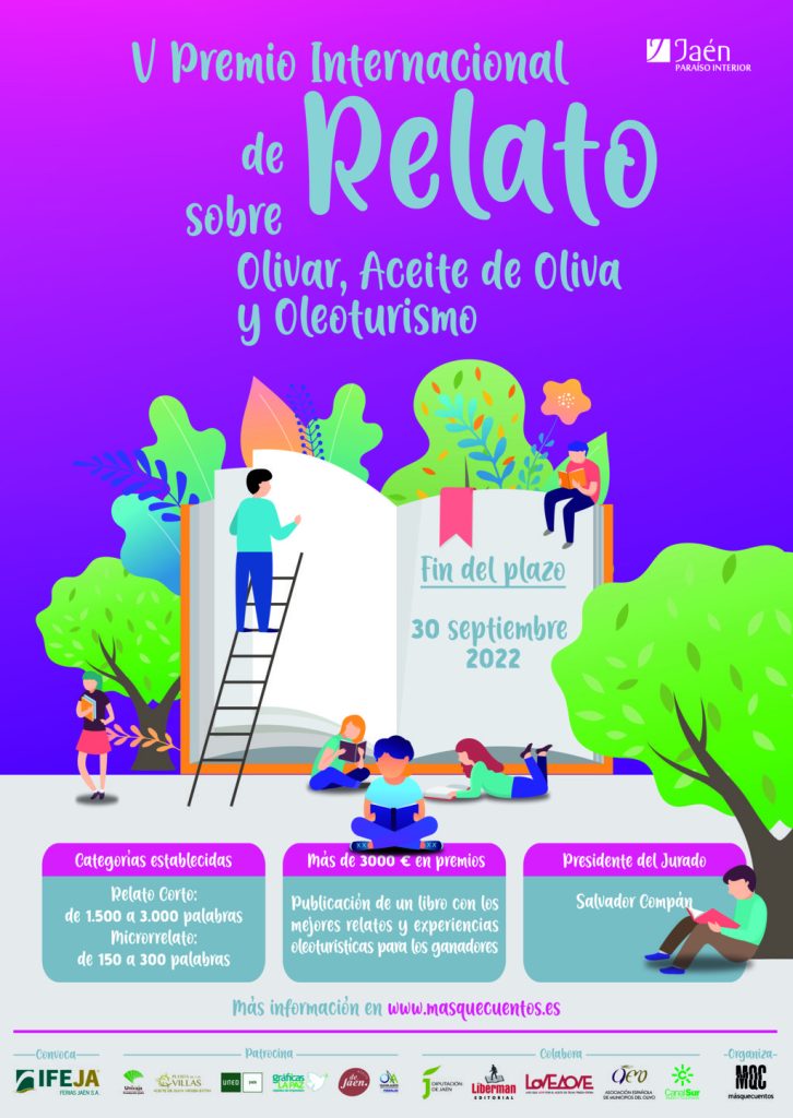 La quinta edición del Premio Internacional de Relato sobre Olivar, Aceite de Oliva y Oleoturismo ya se puede considerar como la más exitosa en la historia de este certamen literario que convoca Ferias Jaén y organiza la Asociación Cultural Másquecuentos (MQC). Este año han sido 320 los cuentos recibidos, muy por encima de los 243 que se registraron en la tercera edición de este concurso que cuenta con el patrocinio de la Fundación Unicaja Jaén, la SCA San Vicente de Mogón y su AOVE Puerta de Las Villas, Gráficas La Paz, la IGP Aceite de Jaén y el Centro de Interpretación del Aceite y el Olivar de Úbeda; y la colaboración de la Diputación Provincial de Jaén, la editorial Líberman, la empresa Love AOVE, la Asociación Española de Municipios del Olivo (AEMO) y la RTVA.