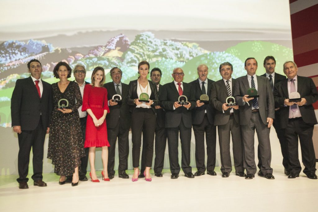 El evento, celebrado en el Museo Nacional Reina Sofía de Madrid y conducido por Mónica Carrillo y Carlos Sobera, desveló la nueva imagen de marca, más actual y atractiva para acercarla a más consumidores y mercados. Expertos catadores valoraron la añada ‘Gran Selección’ de la reserva 2013, como «magnífica». La DO ha incluido el producto deshuesado y loncheado dentro del pliego de condiciones. • Guijuelo premió a José Ribagorda, Juan Rosell, Samantha Vallejo-Nájera, Carmen Posadas, Julen Lopetegui y Vicente del Bosque por alcanzar la plenitud profesional y personificar los valores de la marca. La directora de orquesta Inma Shara y el humorista Leo Harlem, embajadores Guijuelo, entregaron los premios. En la imagen, foto de grupo.