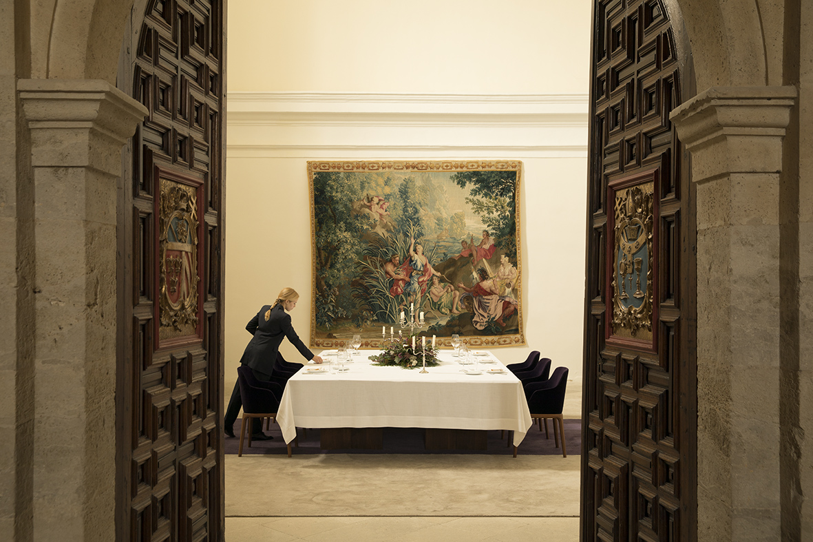 Vista de la mesa en la Sala Sacristía, un espacio elegante y acogedor.