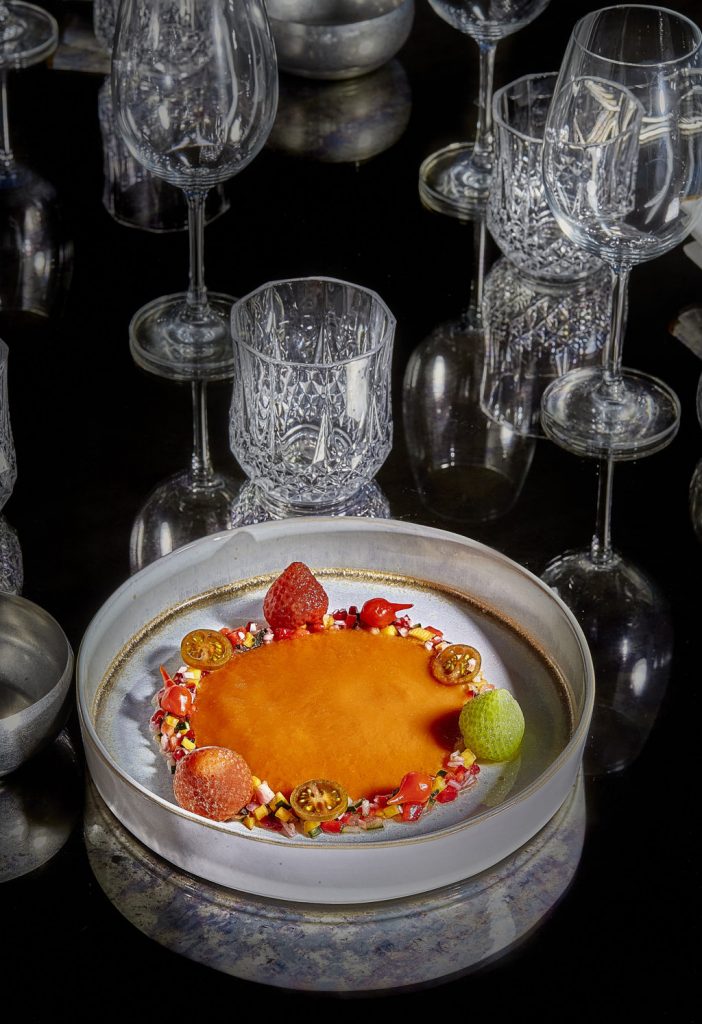 Situado en la sexta planta de este emblemático edificio, está gestionado por Life Gourmet Catering en colaboración con Ramón Freixa, al frente de los fogones, y Luís García Fraile, al cargo del interiorismo. El nuevo restaurante, que ofrece una cuidada carta con tintes internacionales y un exquisito ambiente, se presenta como el nuevo ‘place to be’ de Madrid. En la imagen, gazpacho de fresas con su mimético helado, uno de los sugerentes entrantes de la propuesta.