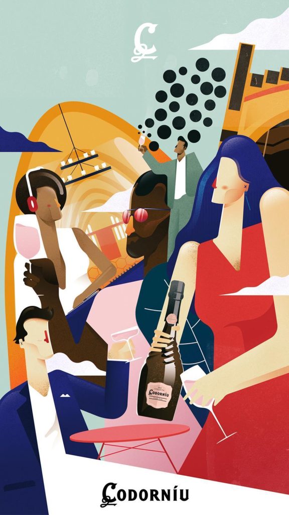 El director de arte Antonio Domínguez ha ganado la segunda edición del concurso de carteles de Codorníu con la ilustración digital “Momentos Codorníu”. Las finalistas han sido la ilustradora Anna Carazo; la artista Sandra Modrego; la primera artista NFT española Gala Mirissa; y la diseñadora gráfica, artista y bailarina Mariana Schrader, con un premio de 2.000 euros cada una. El ganador ha conseguido un premio de 10.000 euros.