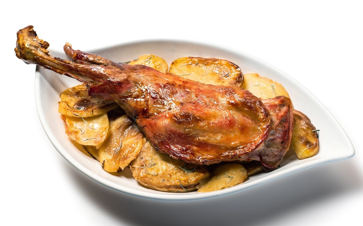 Delicioso Ternasco de Aragón asado acompañado de patatas.