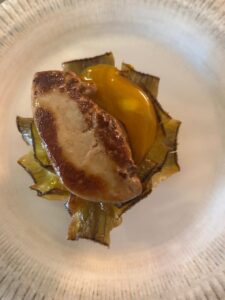 Los sábados prepara su cocido “a su manera”, que cuece a fuego lento desde las 11 de la noche hasta el mediodía del día siguiente, obteniendo un sabrosísimo caldo en el que cuece los garbanzos. Entre sus platos más representativos: la musaka de vieira y gambón con papada ibérica, alcachofas con huevo curado y un lomo bajo madurado, pensado para compartir y acompañado de tomates de los de verdad, recién traídos del próximo Mercado de la Cebada.