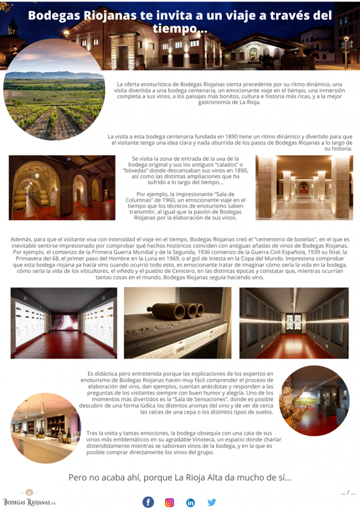 La oferta enoturística de Bodegas Riojanas sienta precedente por su ritmo dinámico y por tratarse de una visita divertida a una bodega centenaria, un emocionante viaje en el tiempo, una inmersión completa en sus vinos, en los paisajes más bonitos, cultura e historia más ricas, y en la mejor gastronomía de La Rioja.