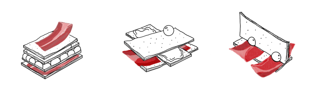 Llegamos a las Bodegas Naturales de Cinco Jotas en la segunda etapa, un espacio donde se respira la tradición y excelencia de curación de cada pieza de jamón. Para transformar el espacio donde nos encontramos y trasladarnos al interior de las bodegas, el pack incluye una estructura con cuentas emulando cada pieza de jamón. Una fase en la que el comensal se mimetiza con los maestros responsables de la elaboración de cada jamón Cinco Jotas a través de las siguientes etapas.