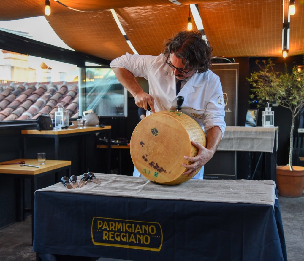 El corte manual de una rueda de Parmigiano Reggiano es un verdadero arte, casi tanto como la elaboración artesanal de este famoso queso italiano, que se mantiene inalterable desde hace siglos. Solo un corte correcta y hábilmente ejecutado permitirá que la rueda de Parmigiano Regiano libere sus aromas, sabores y texturas en su máxima expresión. Simone Ficarelli, del Consejo Regulador de la DOP Parmigiano Reggiano (en la imagen) ha conducido el evento de apertura de una rueda de Parmiggiano Reggiano de 40 kilos en Madrid . Deslumbrante.