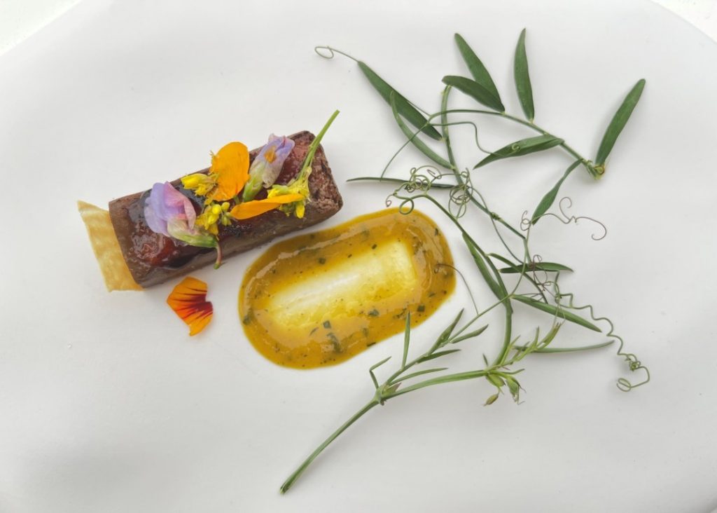 El plato se presenta en la mesa como un medallón de foie gras ovino, con salsa de naranjas de su finca, vino dulce de Agala (Tejeda), sopleteado con azúcar de caña, y sobre una tosta de pan de masa madre tocado de una “mantequilla” de la grasa curada del corazón de la oveja, muy melosa y sedosa. Todo, por supuesto, circunscrito sin fugas a las cumbres grancanarias, el hogar de Marrero.