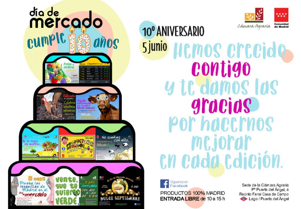 El Día de Mercado que organiza la Cámara Agraria de la Comunidad de Madrid celebra este sábado, 5 de junio, su 10 Aniversario en su habitual sede de la Casa de Campo de Madrid. Y lo hace, como siempre, con entrada libre de nueve de la mañana a tres de la tarde, con la reivindicación de los mejores productos estacionales de la región.