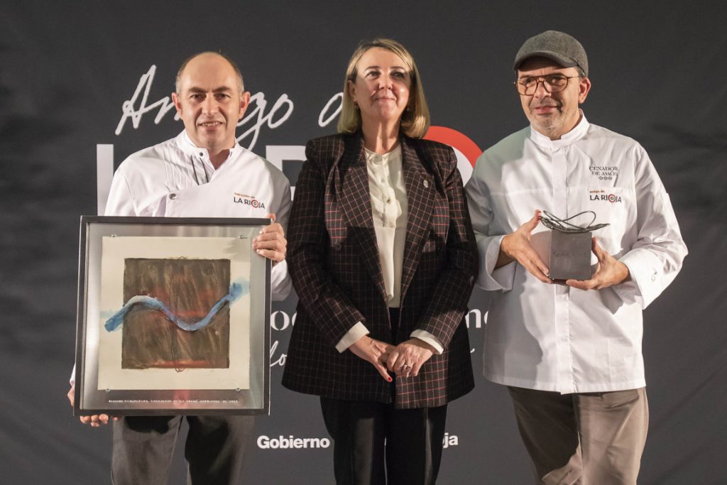 El Gobierno de La Rioja ha nombrado a los cocineros Jesús Sánchez, tres estrellas Michelin en Cenador de Amós, ‘Amigo de La Rioja’ y a Ignacio Echapresto, una estrella Michelin en Venta Moncalvillo, ‘Embajador de La Rioja’. La consejera de Agricultura, Ganadería, Mundo Rural, Territorio y Población, Eva Hita (en la imagen, junto a los galardonados) les ha entregado esta distinción en forma de galardón en un acto que ha tenido lugar en el Círculo Logroñés, en presencia de representantes del sector agrario, agroalimentario y gastronómico de La Rioja.