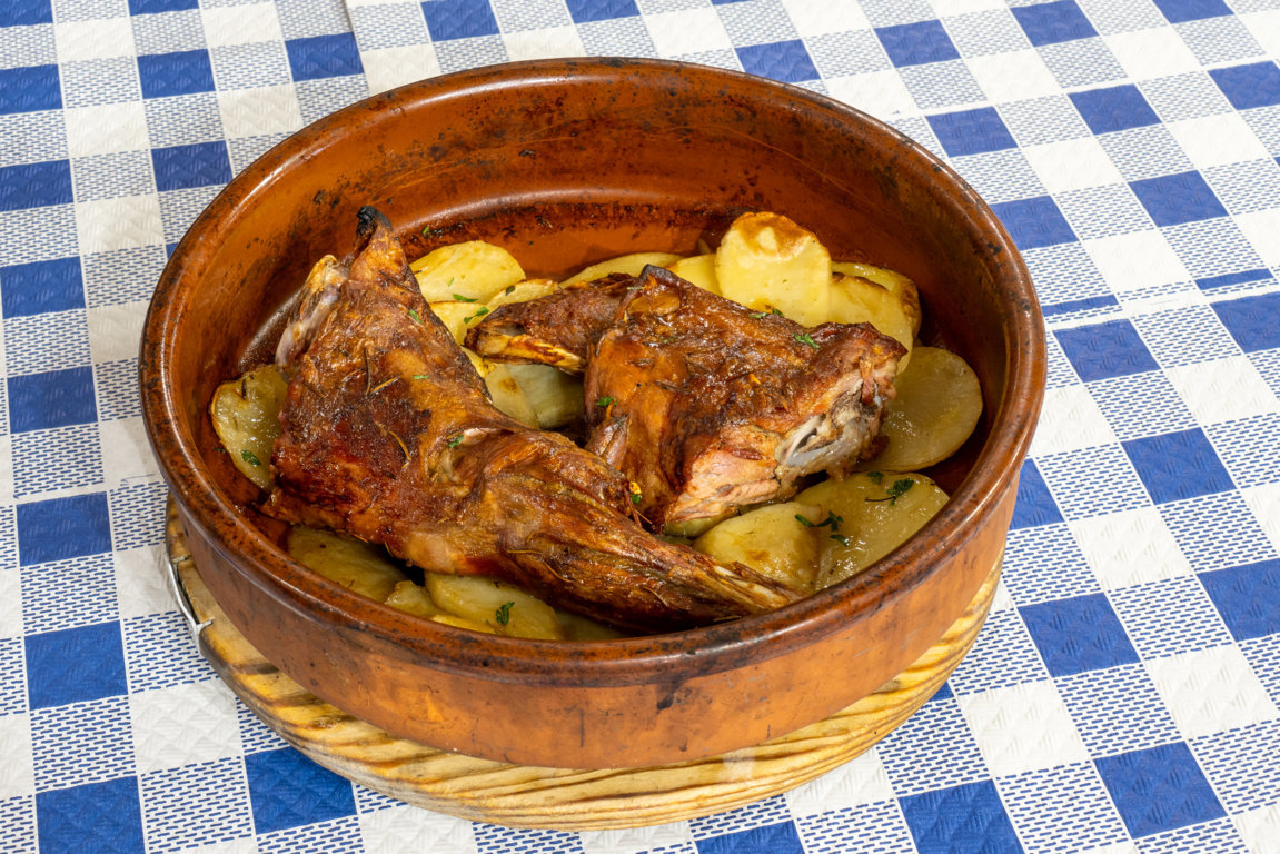 Plato de ternasco asado tradicional con patatas panadera en un recipiente de barro