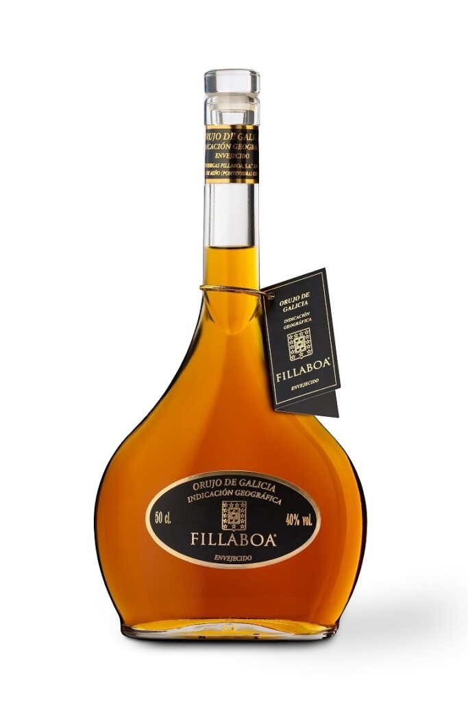 El Orujo Envejecido Fillaboa (I.G. Orujo de Galicia) se presenta desde el pasado año 2022 en una nueva y estilizada botella. Este aguardiente se obtiene a partir del envejecimiento del Orujo Blanco. Durante mínimo siete años el aguardiente envejece en barricas de roble francés Limousine de 225L. ubicadas en la bodega. De un color ámbar, este destilado es limpio y brillante. En nariz desprende aromas a vainilla, tostados y recuerdos de roble francés. Posee notas de piel de naranja, frutos secos y recuerdos a tofe. En boca es complejo, untuoso y suave. Se recomienda servir a una temperatura de 15-18º y posee una guarda potencial de 20 años. Este orujo ha obtenido también la Medalla Gran Oro en la Guía de Vinos, Destilados y Bodegas de Galicia 2022 y fue galardonada en las Distinciones Gallaecia, Aguardientes y Licores Tradicionales de Galicia 2022.