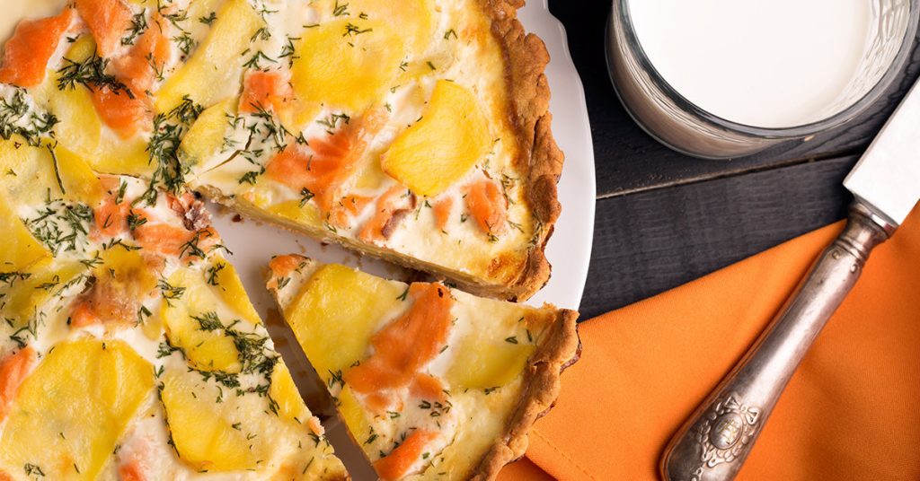 Este alimento es rico en vitaminas A y D, que ayudan al cuerpo a absorber el calcio y a mantener los huesos y los dientes sanos. El queso también es rico en vitaminas del grupo B, entre las que destaca la B12, la B9 (ácido fólico), la B1 (tiamina) o la B2 (riboflavina). ¿Cómo mejorar el rendimiento intelectual y deportivo? Entre las 3 raciones de lácteos que debemos tomar por día, según marcan las principales guías de alimentación, siempre será una buena idea que alguna de ellas sea queso. En la imagen, una quiche de salmón.