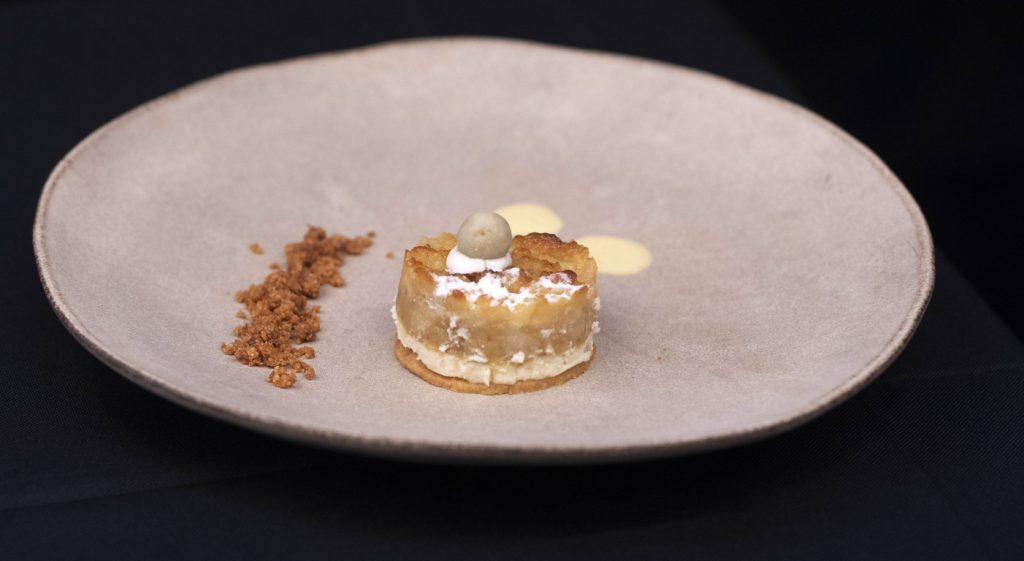 Sobre su receta añadía: “uso una parte de la manzana para el puré y otra la caramelizo. Hago una tarta de queso y esa es la base, una tarta poco hecha. Después le pongo una sablé de mantequilla en la base para que cruja y arriba pongo la manzana caramelizada y un crumble que se deshace en el horno cuando la cocino. Con el puré de las pieles también hemos hecho una manzana cristalizada”.