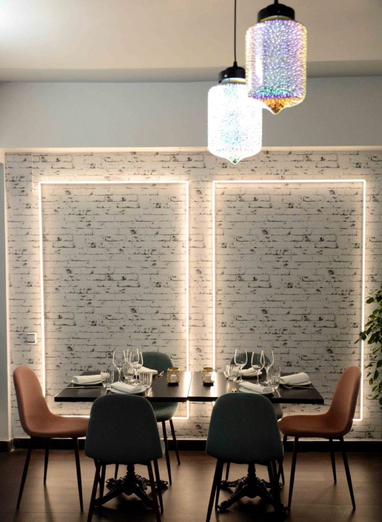 Al entrar, encontramos una sala polivalente muy luminosa gracias a sus amplios ventanales orientados a la calle. La planta se distribuye en dos alturas presidida por una lámpara de araña: una zona con mesas altas y una barra de grandes dimensiones donde poder disfrutar de un picoteo o una comida más informal y otra, con mesas y un banco corrido tapizado en capitoné blanco, para degustar con calma sus propuestas. En la entreplanta encontramos un espacio más íntimo dispuesto entorno a un coqueto patio ajardinado con capacidad para 50 personas.