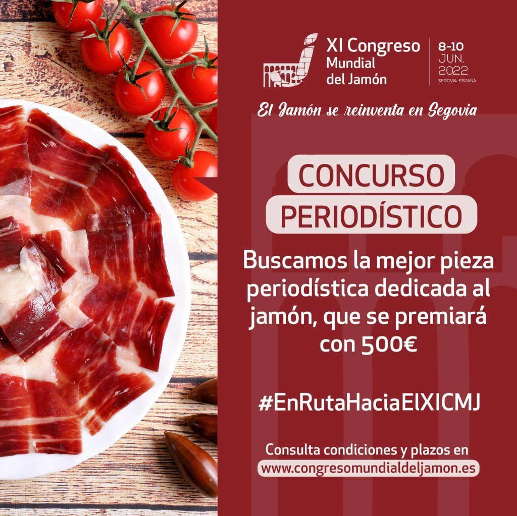 El Congreso Mundial del Jamón organiza un concurso periodístico nacional dirigido a profesionales de la comunicación, que se premiará con 500€. La sostenibilidad integral, el jamón ecológico, las nuevas tendencias de su consumo, su aporte contra la despoblación y el comercio exterior son algunas de las temáticas que los jueces esperan encontrar en las piezas presentadas. Las propuestas han de enviarse al correo electrónico del congreso: info@congresomundialdeljamon.es. El XI Congreso Mundial de Jamón se celebrará los próximos 8, 9 y 10 de junio de 2022 en Segovia.