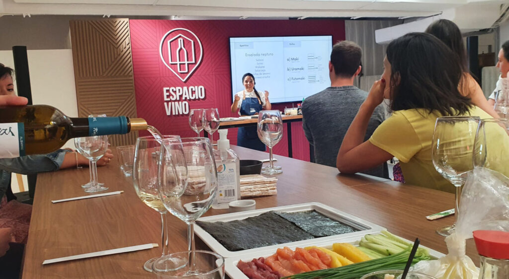 La propuesta, creada por la Interprofesional del Vino (OIVE) reunió a más de 5.000 personas, en un lugar creado para vivir experiencias únicas en torno al vino español. Los premios del marketing alimentario se convocan anualmente por las revistas Ipmark y DARetail, de la mano de Feria Alimentaria. En la imagen, el Taller Suhi y Vino, en el marco de Espacio Vino.