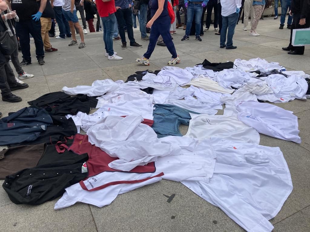 El manifiesto de los hosteleros (leído por Juanjo López, propietario de La Tasquita de Enfrente, junto a la presidenta de Facyre, Pepa Muñoz)  recoge peticiones como facilitar la apertura de los locales, mayor agilidad en la reincorporación de los equipos y que se tenga más en cuenta al sector en las decisiones que les competen. En la imagen, las chaquetillas que los chefs presentes lanzaron al suelo, en gesto de protesta, frente al Congreso de los Diputados.