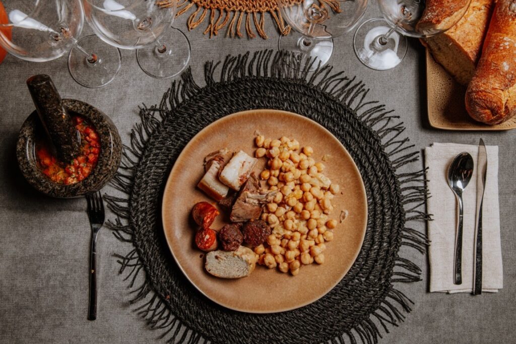 Juan Luis Dastis, chef de Leaves, ha diseñado este cocido en el que se sirve el tuétano a la brasa de carbón con un majado de tomate, comino, ajo y aceite receta de su abuela. El servicio del cocido se hace en tres vuelcos, comenzando por la sopa, para continuar, se sirven los garbanzos acompañados de las verduras incluyendo el repollo rehogado y, para finalizar, las carnes, incluyendo el tuétano.