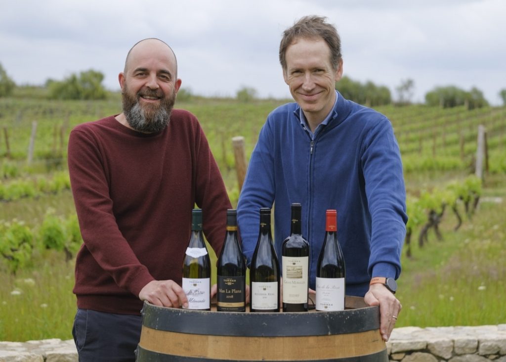 La bodega presenta las nuevas añadas de sus vinos más exclusivos: Milmanda 2019, Mas La Plana 2018, Reserva Real 2018, Grans Muralles 2018 y Mas de la Rosa 2019. En la imagen, Josep Sabarich y Miguel Torres Maczassek durante la presentación en el Penedés.