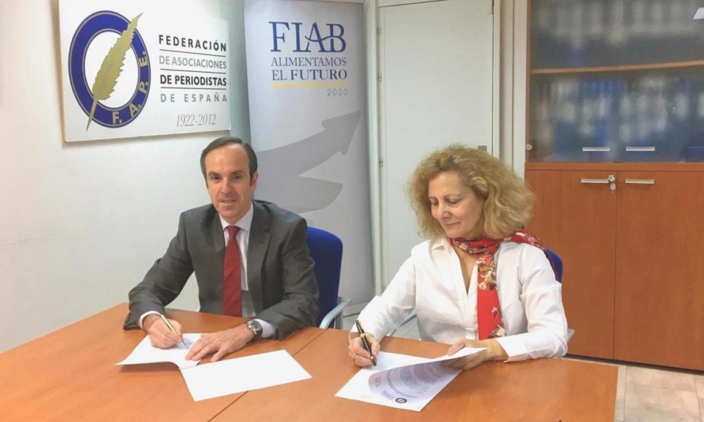 La Federación Española de Industrias de la Alimentación y Bebidas (FIAB) y la Federación de Asociaciones de Periodistas de España (FAPE) han firmado un Convenio para la elaboración de un Informe sobre el tratamiento de la información de alimentación, nutrición y salud. En la imagen, Mauricio García de Quevedo (Fiab) y Elsa González (Fape), durante la firma del acuerdo.