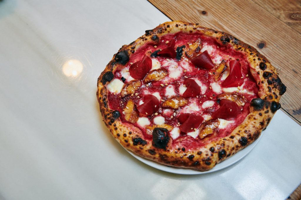 Los chefs, Rafa Panatieri y Jorge Sastre de Sartoria Panatieri junto a Buster Turner de Rooftop Smokehouse unen fuerzas y creatividad este mes de marzo y lanzan una nueva pizza de temporada elaborada a base de remolacha, mozzarella, anguila ahumada (by Rooftop Smokehouse) y almendras (en la imagen).