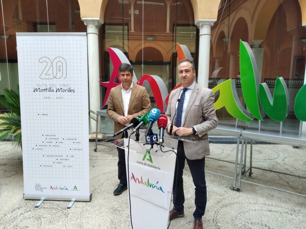 El presidente de la Ruta del Vino Montilla-Moriles, Rafael Llamas Salas, junto al Delegado Territorial de Turismo en Córdoba de la Junta de Andalucía, Ángel Pimentel López, presentaron ante los diferentes medios de comunicación, la Gala que se está organizando con motivo de su vigésimo aniversario con el patrocinio de la  Empresa Pública para la Gestión del Turismo y del Deporte de Andalucía, y que será presidida por el Vicepresidente y Consejero de Turismo, Regeneración, Justicia y Administración Local de la Junta de Andalucía, Juan Marín Lozano.