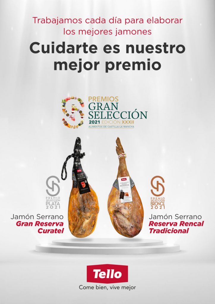 La compañía cárnica Grupo Tello Alimentación ha obtenido una plata y un bronce con dos de sus jamones serranos con Especialidad Tradicional Garantizada (ETG), durante la 32º edición de los Premios Gran Selección, entregados la semana pasada en Puertollano (Ciudad Real). Organizados por la Junta de Castilla-La Mancha, distinguen a los mejores productos agroalimentarios de la región.