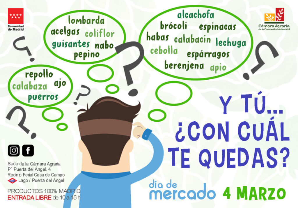 En el próximo Día de Mercado de la Cámara Agraria de Madrid, que tiene lugar el sábado 4 de marzo, de 10 de la mañana a tres de la tarde, en la Casa de Campo madrileña, participarán, como siempre, los mejores horticultores de la Comunidad de Madrid, que llevarán verduras y hortalizas de temporada recién cortadas en sus huertas de Villa del Prado, San Martín de la Vega, Perales de Tajuña, Torremocha de Jarama y Fuenlabrada.