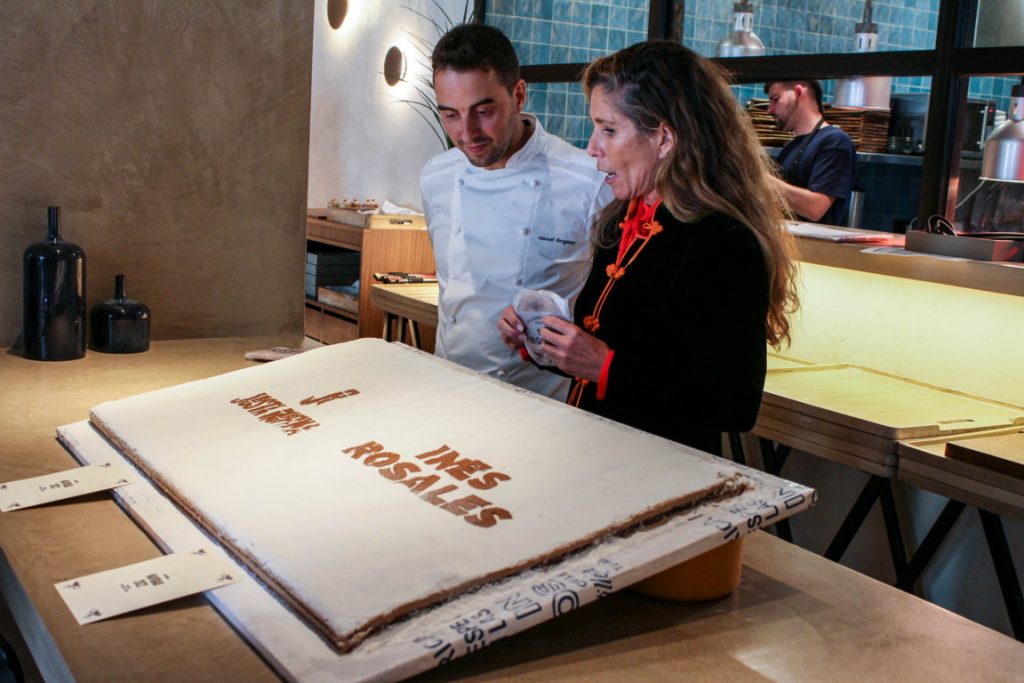 Los duendes navideños han querido juntar al equipo I+D+I de Inés Rosales y al gran chef ejecutivo del grupo Azotea, Manuel Berganza para invitarlos con un regalo único, un «detalle de la casa» en el momento del café. Un “petit four” a la sevillana. Cierren los ojos y háganse a la idea. Se trata de una torta de aceite de Inés Rosales, esta vez con una base de naranja y condimentada con hinojo, clavo, canela y jengibre, que posee un fuerte aroma a Navidad.