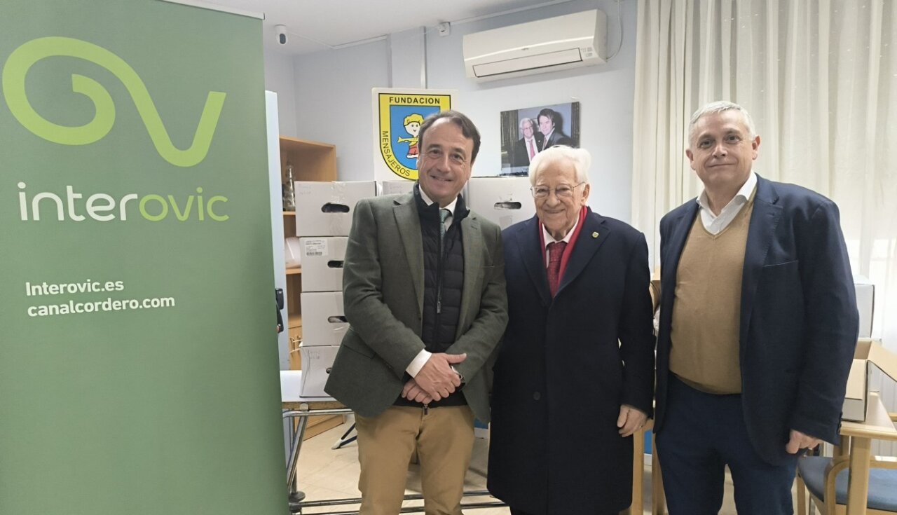 La Interprofesional del Cordero y del Caprino Interovic y Mensajeros de la Paz se unen para llegar la magia de la Navidad a familias en situación de vulnerabilidad. En la imagen, el Padre Angel, flanqueado por Raúl Muñiz y Tomás Rodríguez, representantes de Interovic.