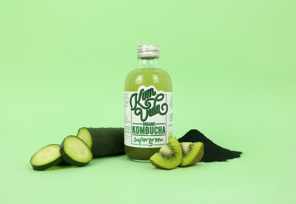 Komvida Supergreen es una kombucha con kiwi, pepino y espirulina, -alga rica en proteínas y vitaminas que ayuda a eliminar toxinas y metales pesados del organismo-, elaborada de la misma forma que todas sus referencias, de manera artesanal y con probióticos que ayudan a equilibrar la microbiota.