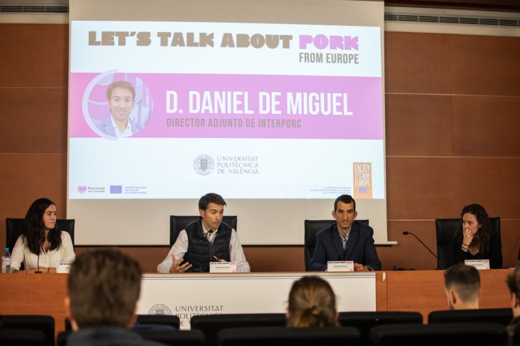 “Let’s Talk About Pork From Europe” regresa a la Universidad (concretamente a la Universidad Politécnica de Valencia (UPV) para debatir y poner en común los últimos avances en sostenibilidad del sector porcino de capa blanca. En el coloquio han participado Daniel de Miguel, director Internacional de Interporc; Salvador Calvet, ingeniero agrónomo y profesor de la UPV; Elena Sanchís, técnico superior del Área de Emisiones de Gases y Medioambiente de la UPV; y la alumna Blanca Fajardo.