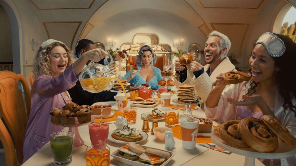 Conocida por su amor por la moda excéntrica y por el vestido de hamburguesa que lució en la fiesta posterior a la Met Gala 2019, Katy deslumbra en el spot con nueve conjuntos que se salen de lo común. Todos ellos basados en sus platos preferidos, los vídeos muestran a Katy comiendo fideos en un dos piezas de Moschino adornado con huevos fritos, disfrutando de un «Sub in the tub» (“quiero un bocata en la bañera”) con una hoja de lechuga con diamantes a modo de traje de baño, y deleitándose con un helado con una tarta como vestido. Katy, una vez más, demuestra su talento como estrella del pop en esta nueva edición, pues ella es la creadora de la música y la letra de la campaña, que sin duda hará cantar a los fans.