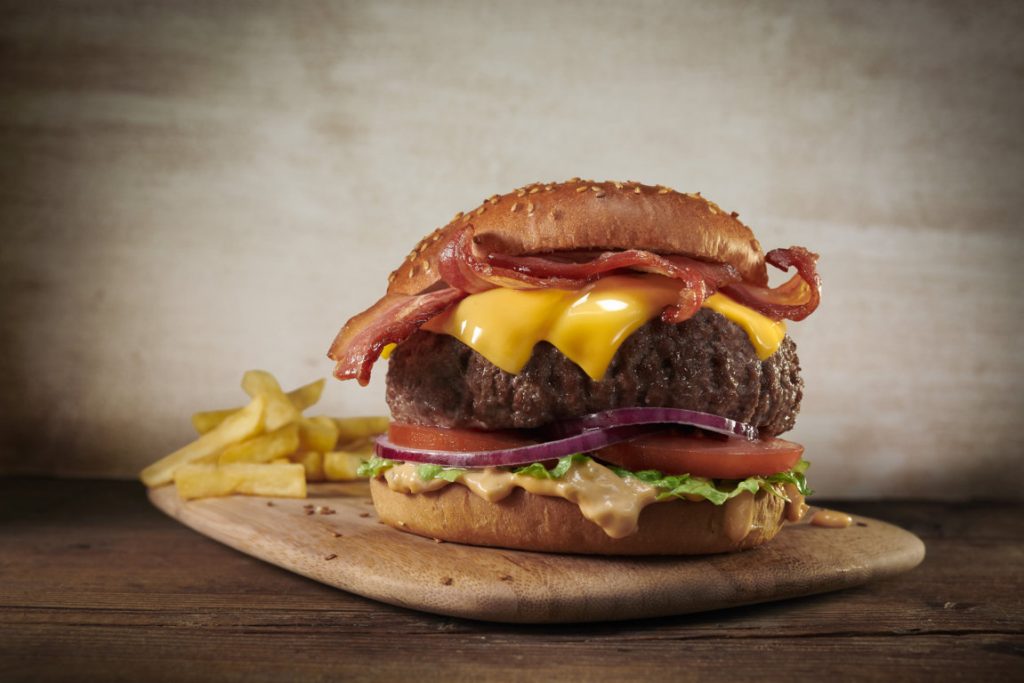 - Y los mejores ingredientes para acompañar la carne: queso Cheddar, bacon ahumado con madera de haya, cebolla morada a la plancha, tomate, lechuga, pan clásico y mayonesa.