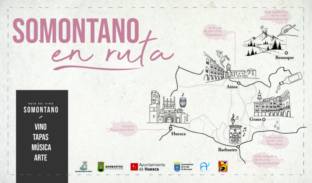 Destacando que la DOP Somontano es la Denominación de Origen de vino de la provincia de Huesca, la Ruta sale de sus fronteras para que todos los oscenses y turistas que estén en los destinos de este ciclo en la fecha de cada evento vivan la magia de ese encuentro en las plazas. La primera parada será la Plaza Mayor de Aínsa el día 16 de julio durante la celebración de su Festival Castillo de Aínsa para después recorrer las plazas de Benasque, Graus y Huesca y clausurar esta primera edición de “Somontano en ruta” el 12 de noviembre en Barbastro, capital del Somontano, con motivo de la celebración del Día Mundial del Enoturismo.