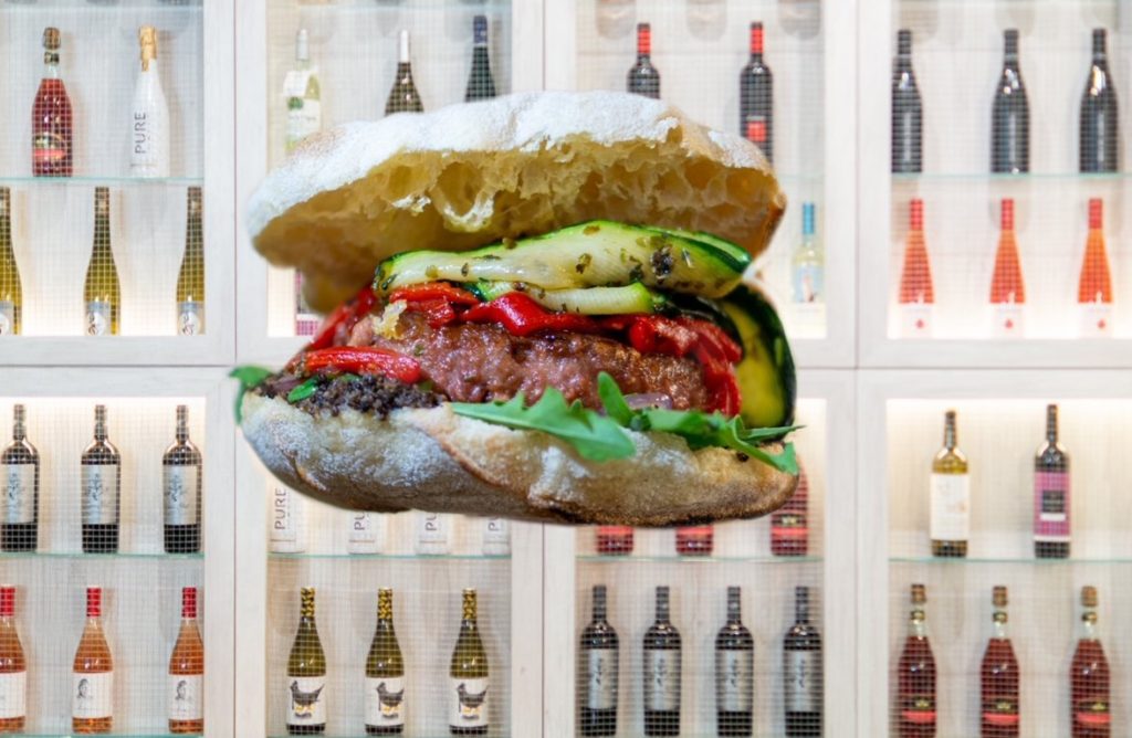 Al puro estilo más tradicional italiano, la trattoria Pizzi Dixie (San Vicente Ferrer, 37. Madrid), con motivo de su V Aniversario, estrena Pizzi Dixie Wine Bar con una amplia selección de los mejores vinos veganos, ¡servidos por copa!, gracias al sistema Coravin que permite servir vino por copas sin necesidad de descorchar la botella y así mantener intactas todas sus propiedades. En la imagen, la Pizzi Burger, otra de las novedades del quinto aniversario, con el fondo del Wine Bar.