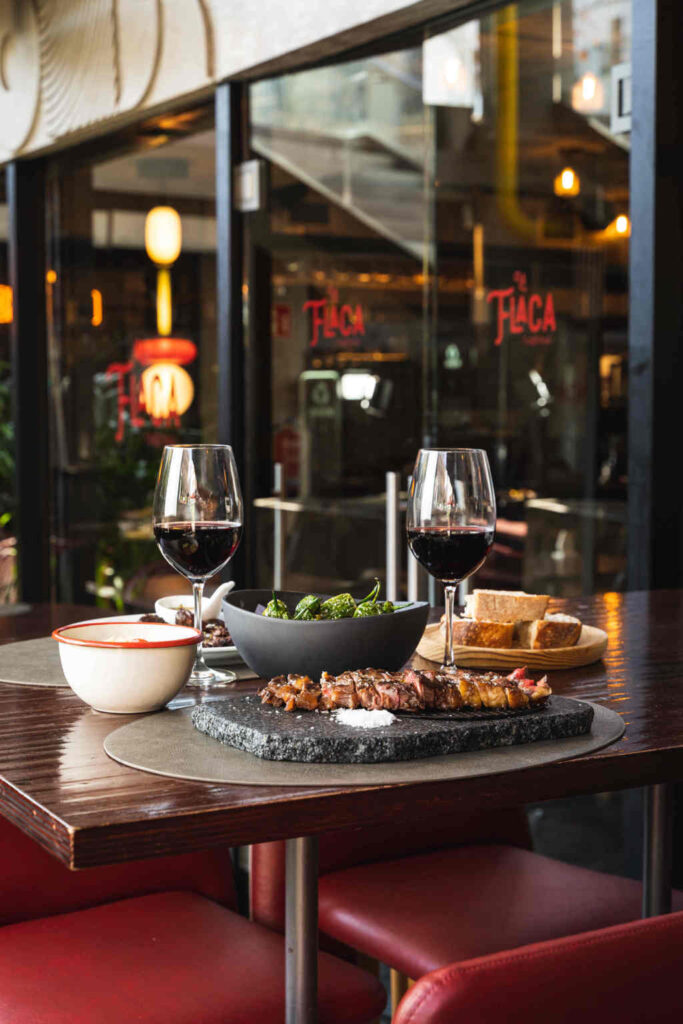 El barrio de Salamanca amplía su oferta de ocio y restauración con este nuevo proyecto de Kike Sierra, que ha sucumbido a lo que su clientela más fiel le pedía desde hace años y al sentir de su corazón. La Flaca es un lugar donde comer bien y pasárselo mejor. Para ello, conserva la excelencia de la cocina de Bar Carallo que deja su impronta en la propuesta gastronómica. Se mantienen platos con gran popularidad, como son el entrecot de vaca rubia gallega a la brasa y patatas; el pulpo a la brasa con patatas revolconas; el mojo canario y Kalamata; el mollete de calamar potera, ralladura de limón y salsa chilli-mayo; el chorizo al inferno o la croqueta de mejillón tigre. El sabor de la cocina más tradicional y castiza.