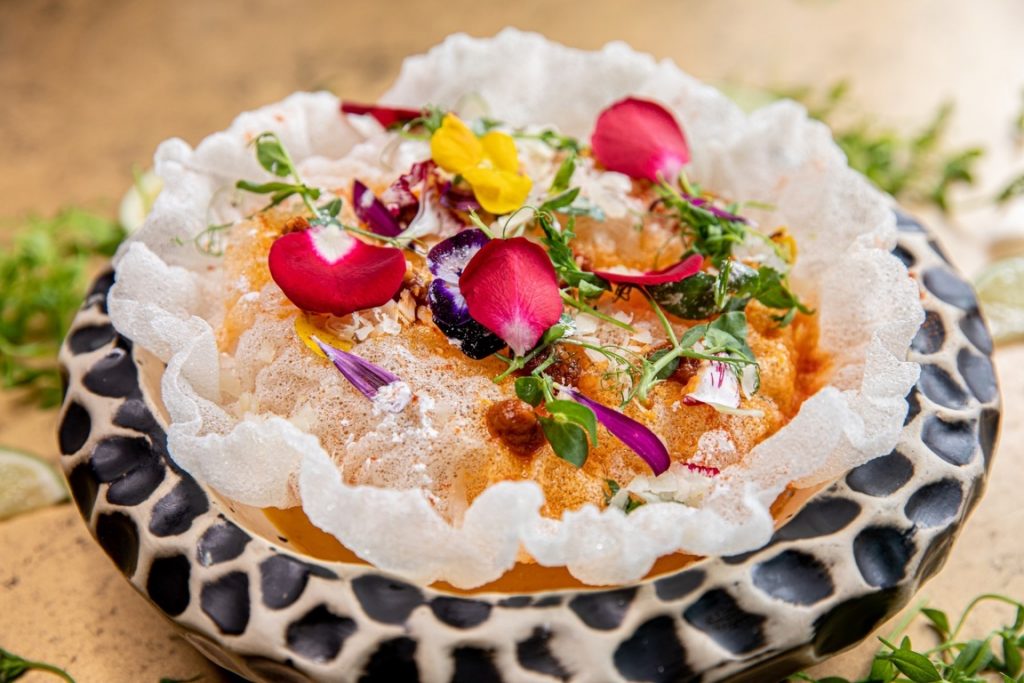 receta primaveral inspirada en las raíces alicantinas del chef: Gazpacho de nísperos y mango con polvo de lima, arroz frito, tomate seco y ralladura