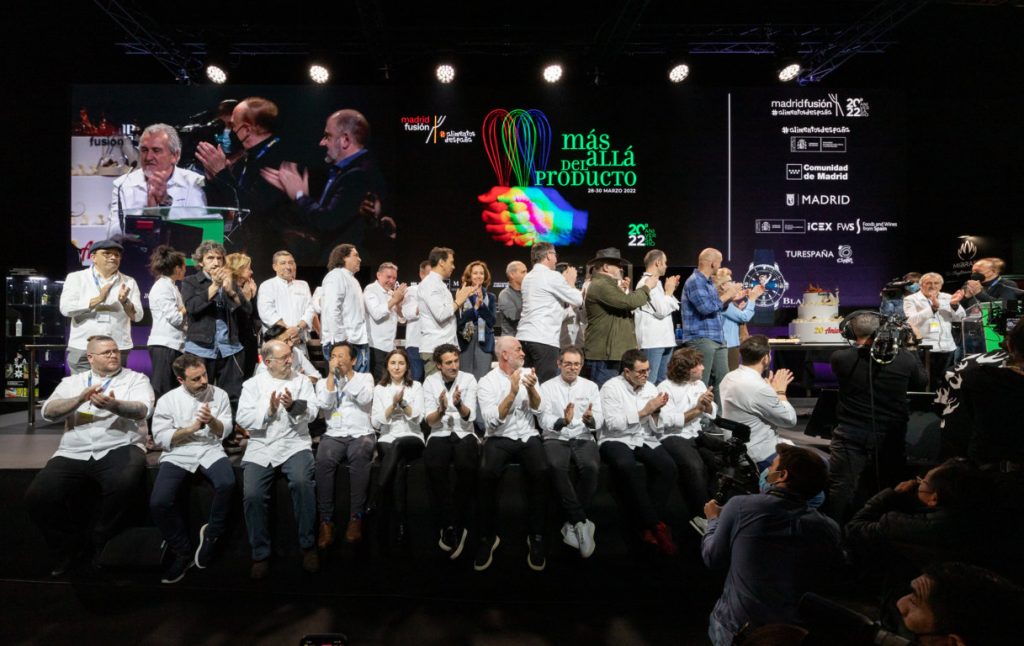 Nunca en la historia del congreso de gastronomía más influyente del mundo hubo más visitantes (16.500), más congresistas (1.171) o más periodistas (1.038). El público respondió la semana pasada en Madrid en un auditorio abarrotado todos los días y participando activamente en las actividades de la zona expositiva. La chef ucraniana Ksenia Amber, recién llegada de Odesa,  cerró el congreso con una emotiva ponencia que sirvió como homenaje y apoyo solidario a su país. El gaditano Pedro Aguilera del Mesón Sabor Andaluz (Alcalá del Valle, Cádiz) gana el Premio Cocinero Revelación y Miguel Carretero (Santerra, Madrid), el Concurso Nacional de Croquetas. Mario Sandoval, Eneko Atxa o Luis Alberto Lera participaron en la última sesión de un congreso que festejó la vigencia de una cita que “abre puertas a las nuevas generaciones”. En la imagen, celebración multitudinaria del 20 Aniversario del Congreso