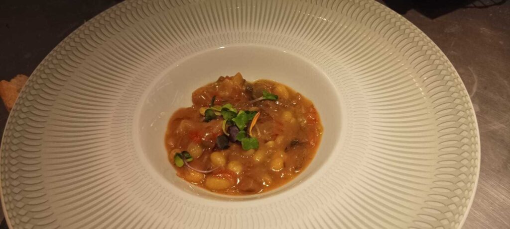 Al apartado de guisos, junto al txangurro Riverita y los callos caseros, se incorpora el guiso de pochas con setas de temporadas y el parmentier de setas, huevo poché y trufa. La alcachofa, otro de las protagonistas de la despensa de invierno, también está presente en la propuesta gastronómica del establecimiento en diferentes elaboraciones, como la alcachofa rellena de rabo de toro, muselina de yuca y trufa fresca del Moncayo o las alcachofas confitadas de Tudela en flor. Riverita también incorpora la vieira al horno con base de puerro confitado y velouté de pescado al pimentón.