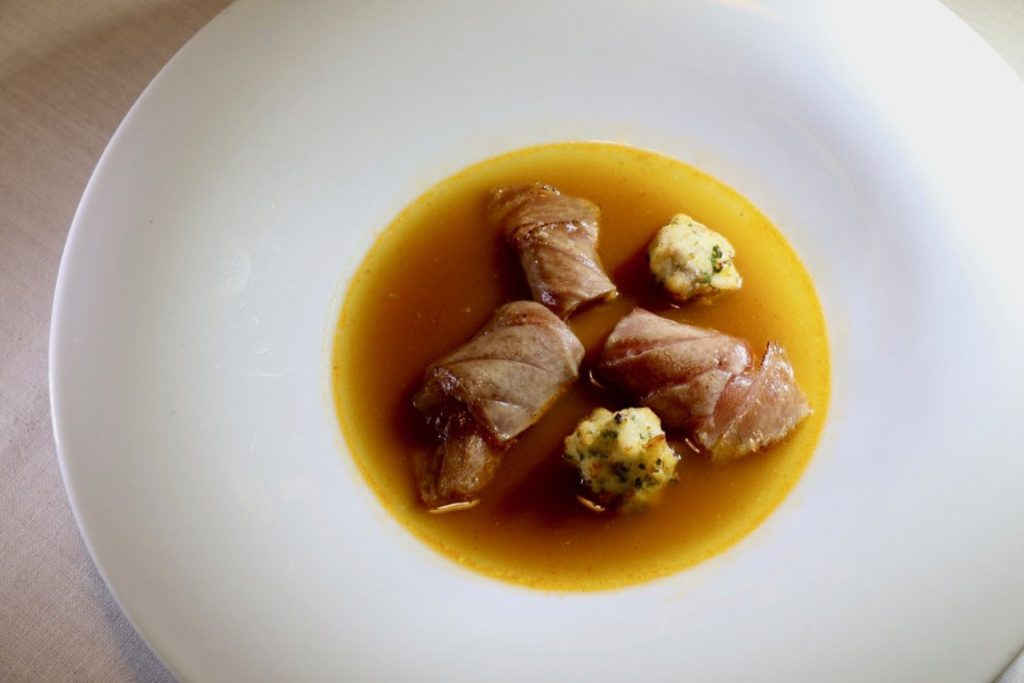 Chutoro togarashi, buñuelo de anguila y all i pebre emulsionado con médula de atún. En armonía con Clarión 2016, Viñas del Vero.