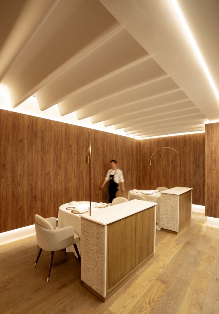Alejandra Pombo firma el interiorismo. El espacio es íntimo y de exquisita calidez gracias a maderas nobles, chimeneas e iluminación tenue. Cuenta con diferentes estancias donde la bodega, con más de 750 referencias nacionales e internacionales imposibles de encontrar en otro lugar, dará paso a la experiencia de sala y cocina vista.