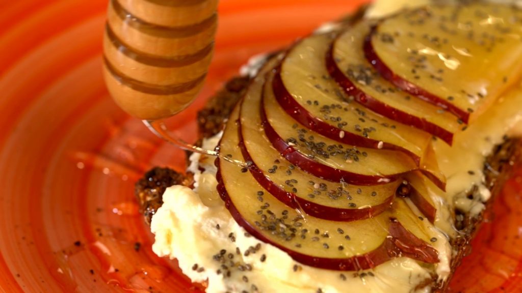 Las propiedades de la miel para potenciar el sabor de algunos alimentos la convierten en una alternativa natural y versátil en la cocina. Nos proponen, tres sencillas recetas para preparar los desayunos más sabrosos y saludables. En la imagen, tosta de ricotta con miel y manzana.
