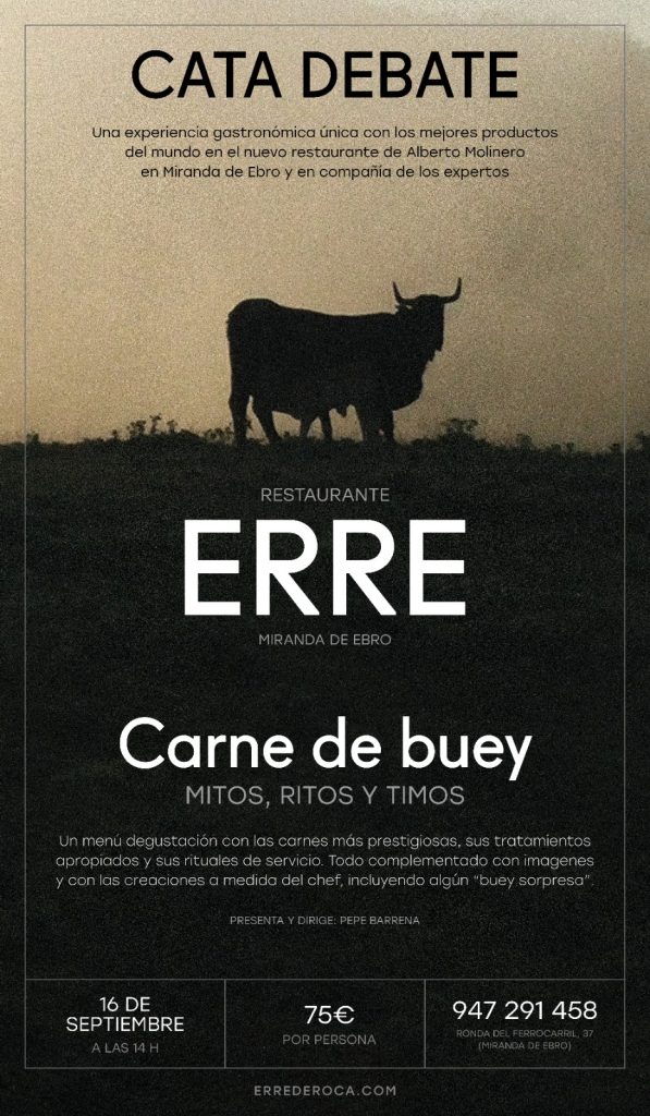 ERRE de Roca (Ronda del Ferrocarril, 37. Miranda de Ebro. Burgos. Tel. 947 291 458. www.errederoca.com), es la nueva propuesta del chef mirandés Alberto Molinero, que está llamado a convertirse en su buque insignia, pues se trata de un espacio ideado para vivir una experiencia gastronómica inolvidable con producto, técnica y genialidad. Con la apertura llegaron también unas didácticas Catas-Debate perfectas para vivir esa experiencia y en las que se analiza la realidad, los tópicos, mitos y ritos de algunos de los mejores productos del panorama nacional. La próxima, el 16 de septiembre, estará centrada en la carne de buey.