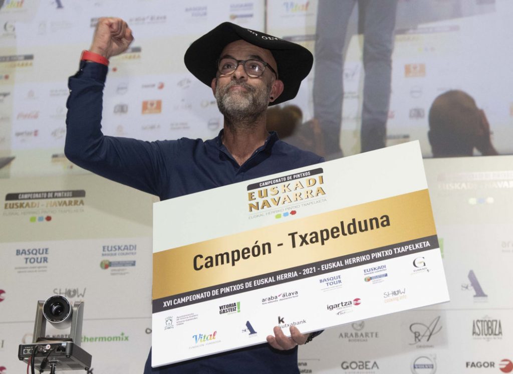 Mitxel Suárez, del Asador Borda Berri de Hueto (en la imagen) se ha proclamado campeón del XVI Campeonato de Euskadi y Navarra de Pintxos – Euskal Herriko XVI. Pintxo Txapelketa, con su pintxo “Txingurri”, una falsa patata rellena de secreto de Euskal Txerri, takiniku, kimchi, habitas y jugo de carne: una apuesta por el producto local, un producto emblemático alavés y un trampantajo presentado sobre una tierra de oreo.