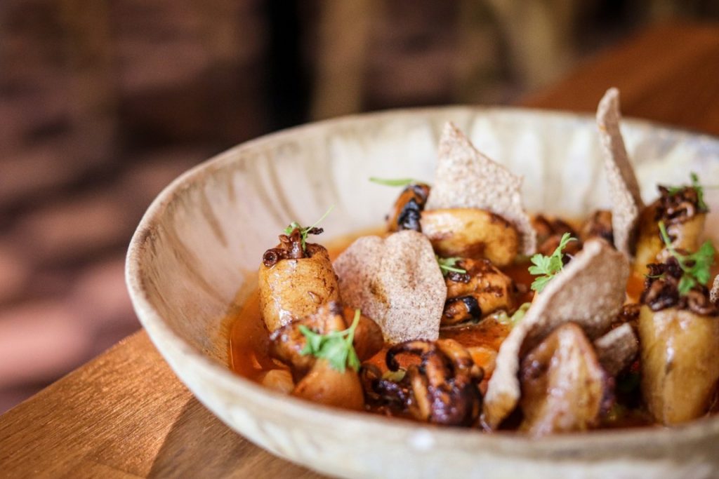 Sergio y Roberto Hernández, que además de capitanear Latasia (Vastellana, 115. Madrid) y Taramara acaban de abrir Taberna Moemia, apuestan por un estilo culinario de mestizaje muy personal, inspirado en sus viajes y en experiencias personales. La carta de verano cuenta con nuevos platos, como el bacalao en curry de algas con sus callos, el solomillo agridulce, el tiradito de lubina, el «solterito» thai de chipirones (en la imagen) o el suspiro cítrico con bizcocho de cacao.