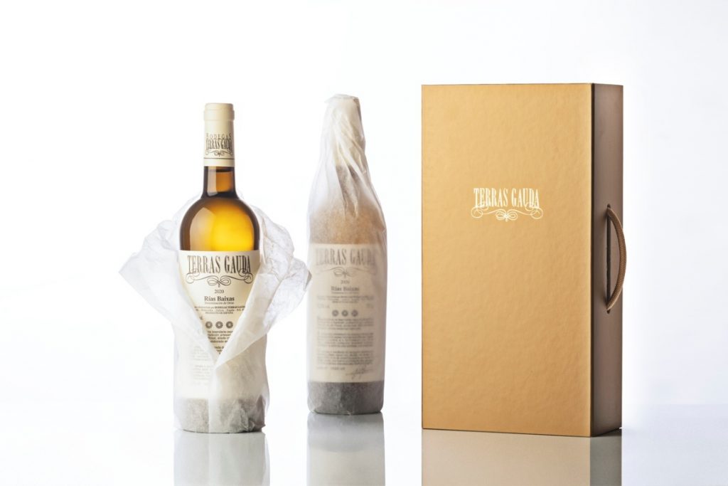 El apego al terruño y la fidelidad a los orígenes se expresan a través de las tonalidades ocres y doradas del estuche, cuyo diseño se ha simplificado al máximo para centrar el protagonismo en el interior: dos botellas de la añada 2020 de Terras Gauda.